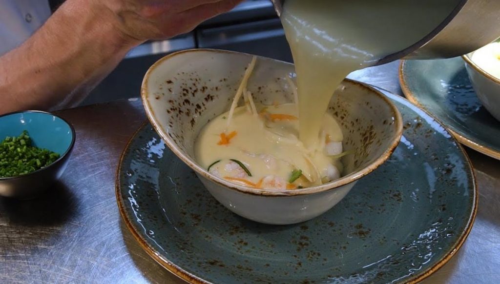 Put the soup in large deep plates, sprinkle over the prawns and serve the soup with fresh bread.